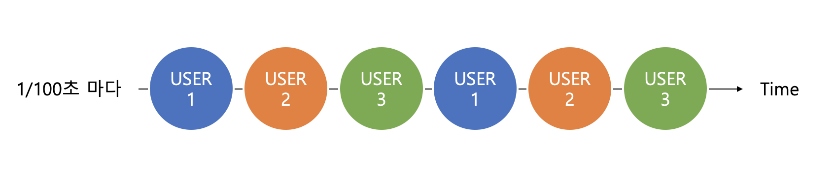 - 짧은 시간마다 유저 프로그램 교체: 예를 들어 1/100초 마다 교체해주면 1초에 100번 교체. 3명이서 사용하면 1초에 33번 할당됨