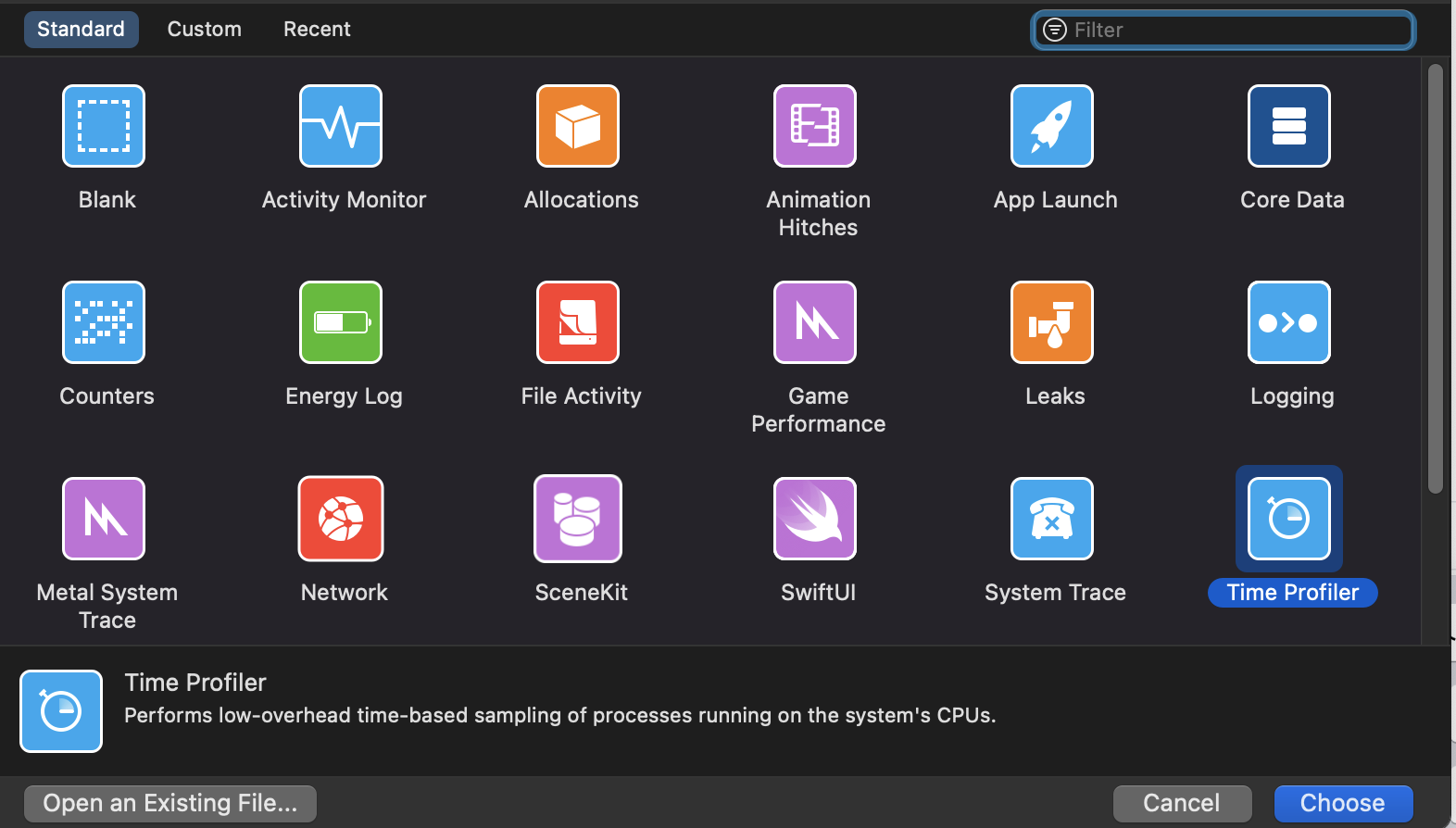 먼저는 Time Profiler로 앱의 콜스택을 실시간으로 확인할 수 있습니다.